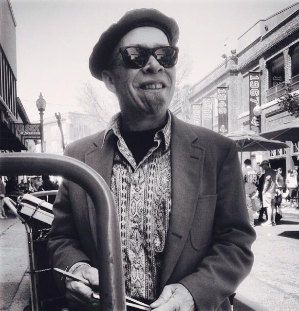 Photograph of drummer Mickey Bones in beret and sunglasses.